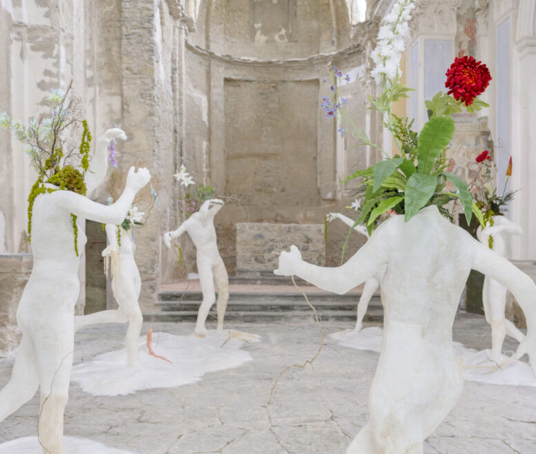 The plaster of the sculptures seems to arise from the very fabric of the building that hosts them, as an ideal extension of Santa Maria in Montanis’s plastered walls. Natural light filtering through the church openings caresses the white surfaces, reflecting on the salt crystallizations scattered across the floor, and contributes to an atmosphere suspended between contemplation and release, spirituality and corporeality. The decision to strip the figures of their faces, replacing them with bouquets of flowers, corals, and crystallized organic matter, not only safeguards the identity of the participants but also transforms each body into a vital vessel of energy and rebirth.